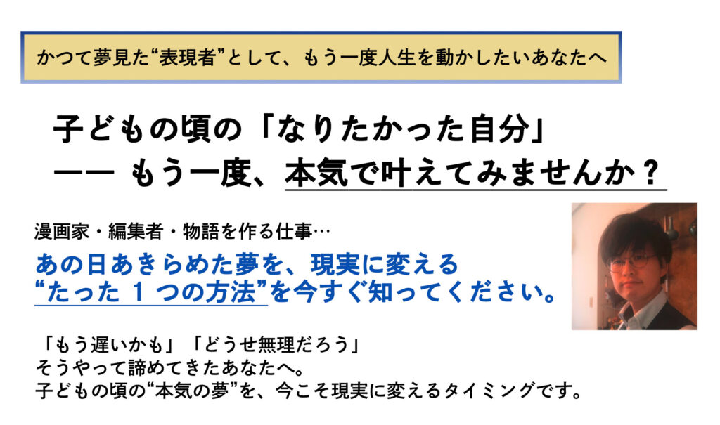 | 『本質がクリエイターである』事が第一義です。 支援型クリエイターで起業して作品を作っていく事が今回の目的になりますので、コンサル・コーチ・カウンセラー・セラピストなどの支援したいだけの方はお断りさせて頂きます。 わからない方は、『あなたは何者?自分診断』を受講の上、個別面談時にご相談ください。私もコーチングができるクリエイターだと気付くのに時間がかかりましたしね。 |